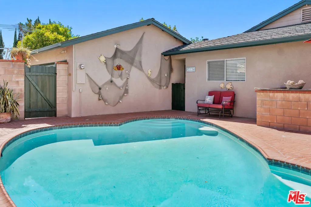 Lovely ranch style home on a quiet suburban cul-de-sac, lined with flowering pear trees. 4 bdrm/2.5 bath. Home features custom oak and maple cabinetry, remodeled country style kitchen, custom fireplace, warm colors, and tile flooring. Brick pool yard with a separate fenced courtyard and raised pond. Private electric gated parking with two car garage. Lovely neighborhood feel - come have a look!