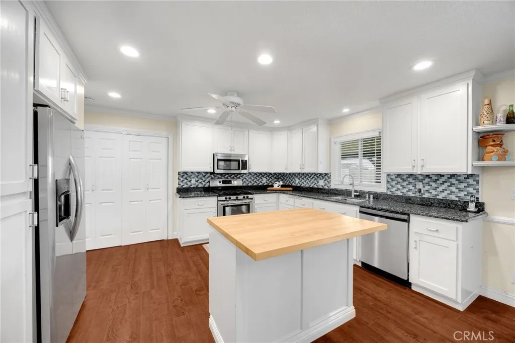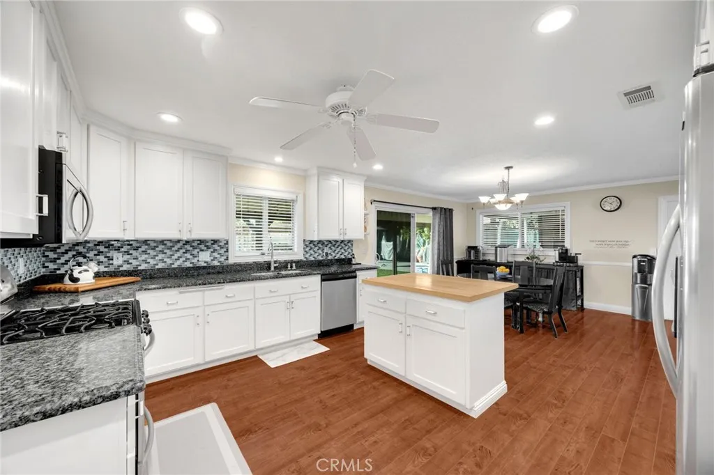 Welcome to this inviting ranch-style single-story home featuring 3 bedrooms and 2 full bathrooms and attached 2 car garage. The living room showcases a cozy pass through fireplace that opens to the kitchen, creating a warm and welcoming space for everyday living and entertaining. The kitchen is thoughtfully designed with granite countertops, a butcher block island, and ample space, seamlessly connecting to a large dining room perfect for gatherings. The generously sized backyard features concrete walkways, a large grassy area, and covered patio.