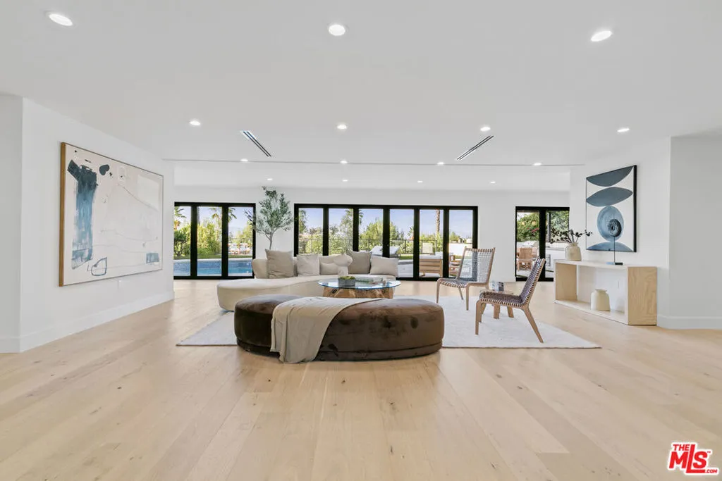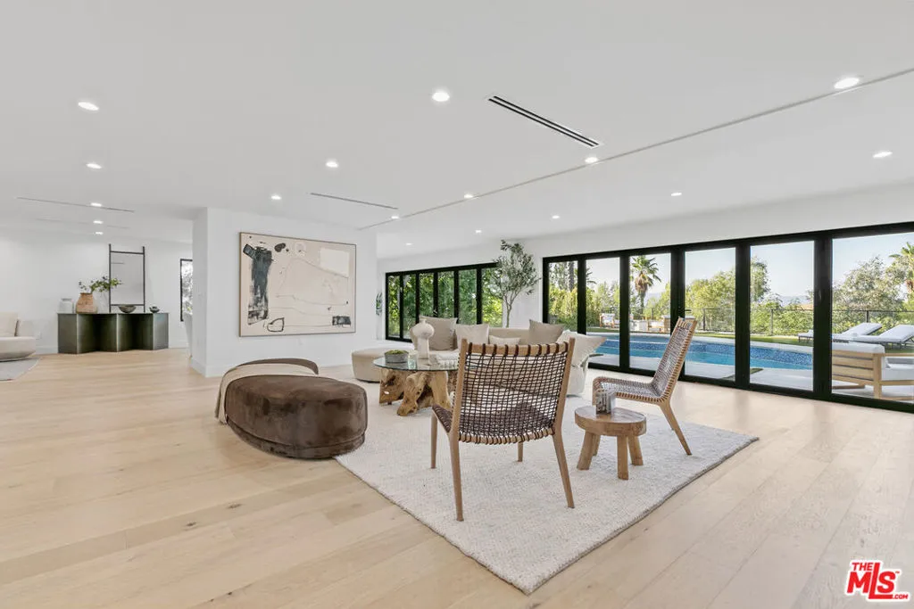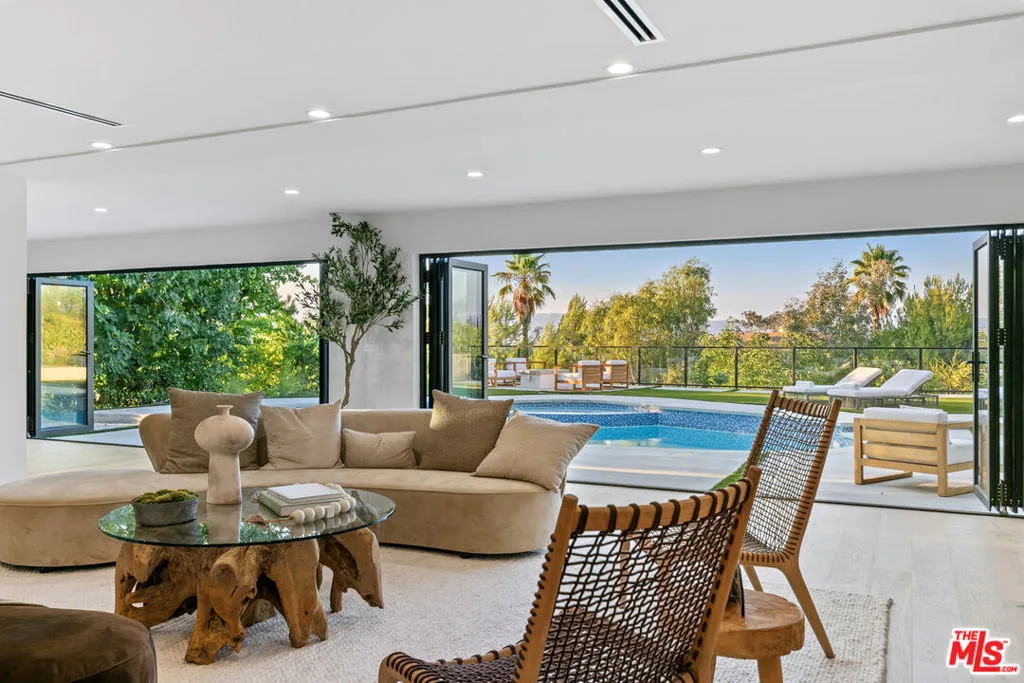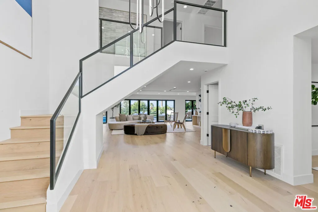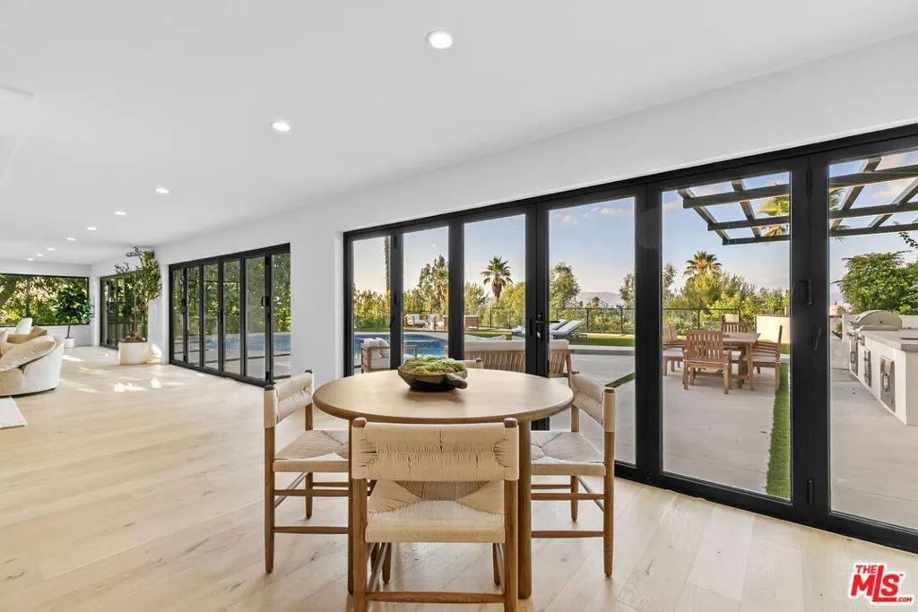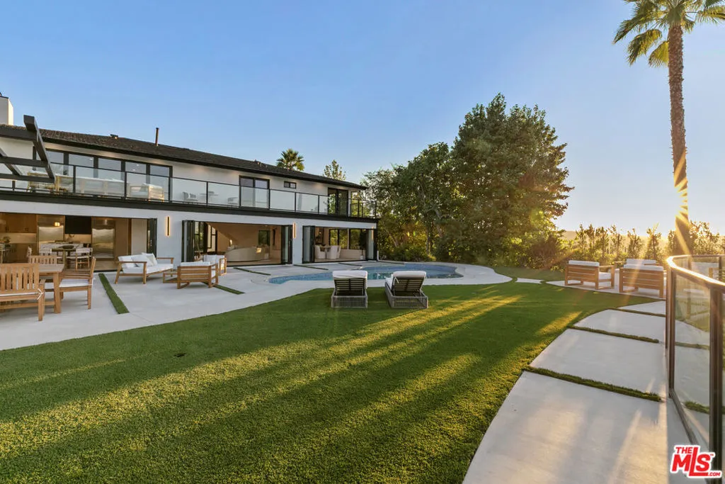 This beautifully updated home set on a spacious 17,487 sq. ft. lot, offers modern luxury, privacy, and panoramic views throughout. Located in the sought-after Lake Encino community, the residence welcomes you with lush landscaping, palm trees, and custom architectural lighting. Inside, a grand 17-ft foyer with hardwood floors and a glass-panel staircase leads to open-concept living spaces filled with natural light. This home includes 6 bedrooms, 4 bathrooms, custom executive office and much more. Doors open to a beautiful backyard featuring a custom pool and spa with Baja shelf, outdoor kitchen with Viking BBQ and Coyote appliances, elegant dining space, and low-maintenance, drought-conscious landscaping. The chef's kitchen is equipped with solid wood cabinetry, quartz countertops, Sub-Zero refrigerator and freezer, and premium Viking appliances. The open layout flows into a spacious living and dining area with fireplace and recessed lighting. HOA amenities include private tennis courts. Optional roaming security available via third-party provider.