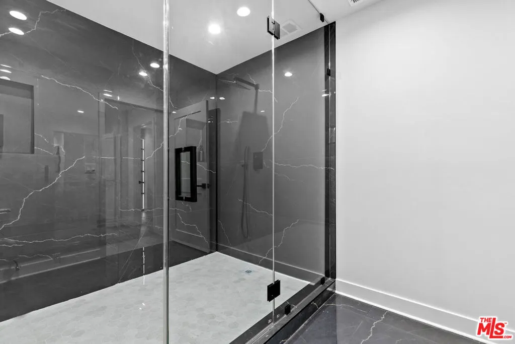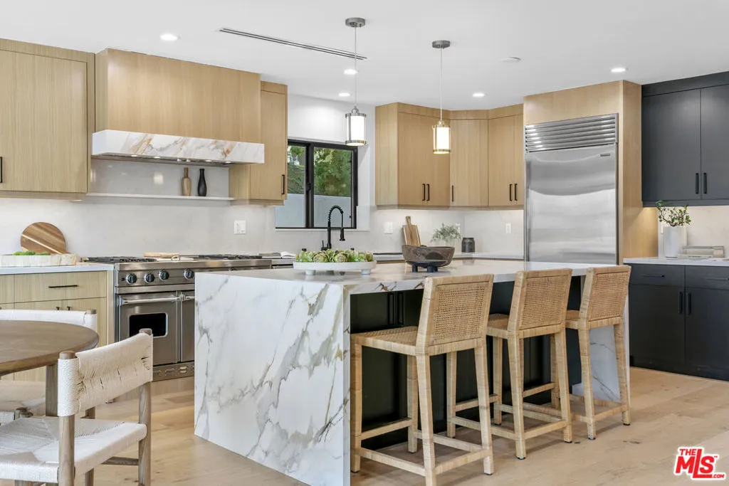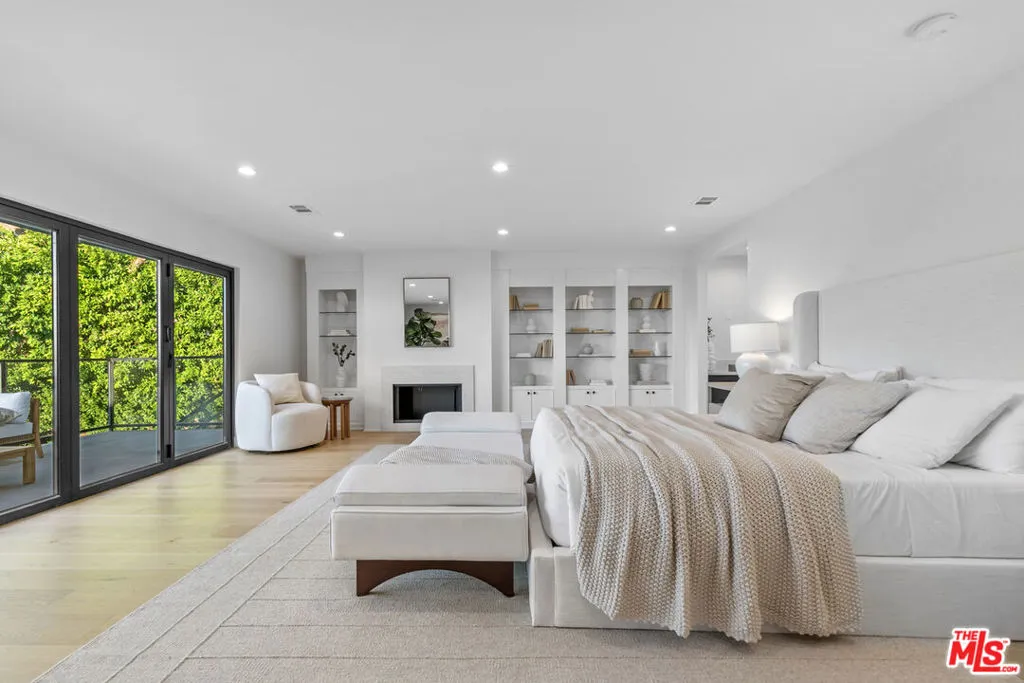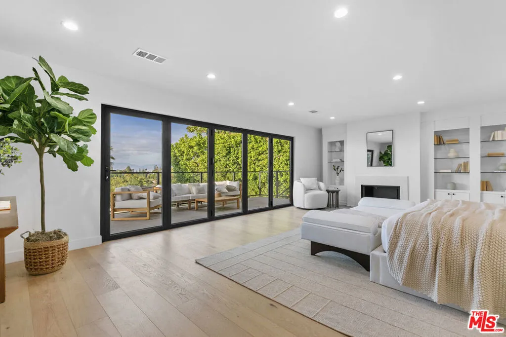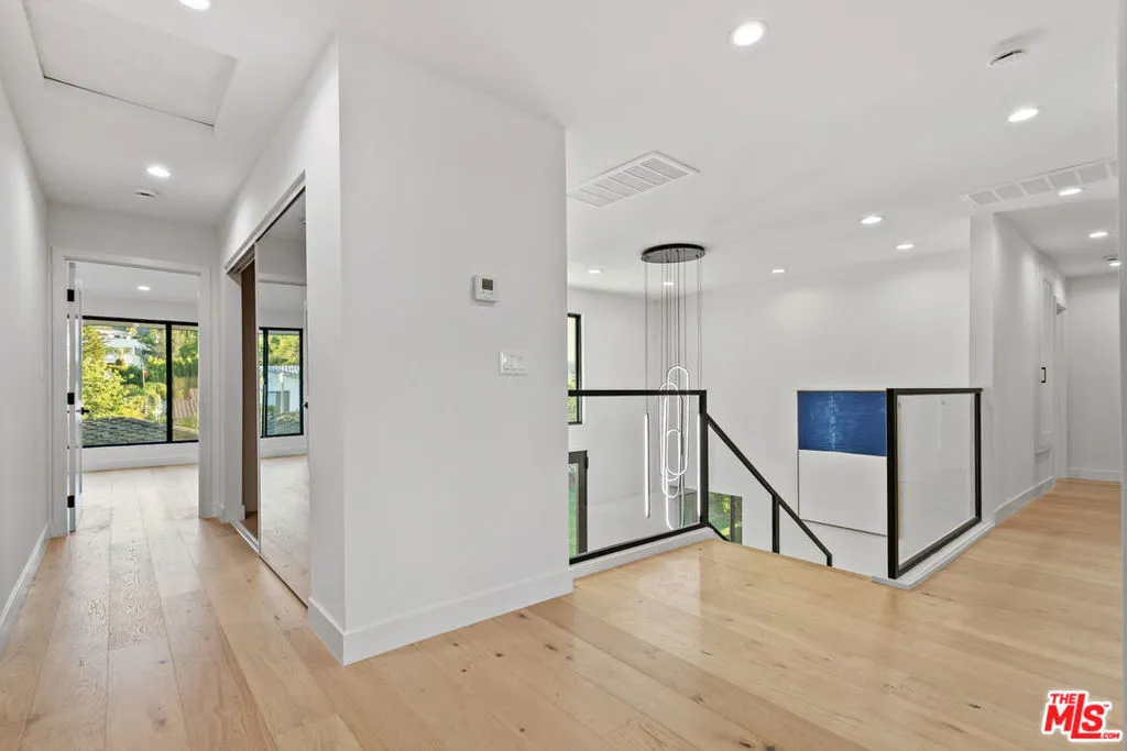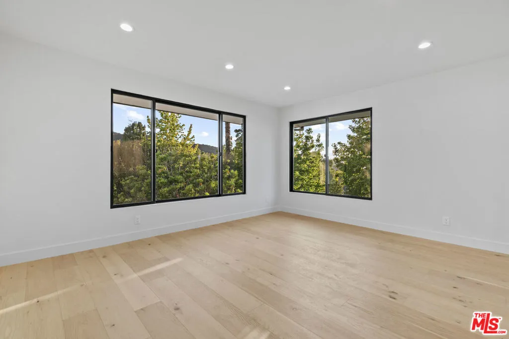 This beautifully updated home set on a spacious 17,487 sq. ft. lot, offers modern luxury, privacy, and panoramic views throughout. Located in the sought-after Lake Encino community, the residence welcomes you with lush landscaping, palm trees, and custom architectural lighting. Inside, a grand 17-ft foyer with hardwood floors and a glass-panel staircase leads to open-concept living spaces filled with natural light. This home includes 6 bedrooms, 4 bathrooms, custom executive office and much more. Doors open to a beautiful backyard featuring a custom pool and spa with Baja shelf, outdoor kitchen with Viking BBQ and Coyote appliances, elegant dining space, and low-maintenance, drought-conscious landscaping. The chef's kitchen is equipped with solid wood cabinetry, quartz countertops, Sub-Zero refrigerator and freezer, and premium Viking appliances. The open layout flows into a spacious living and dining area with fireplace and recessed lighting. HOA amenities include private tennis courts. Optional roaming security available via third-party provider.