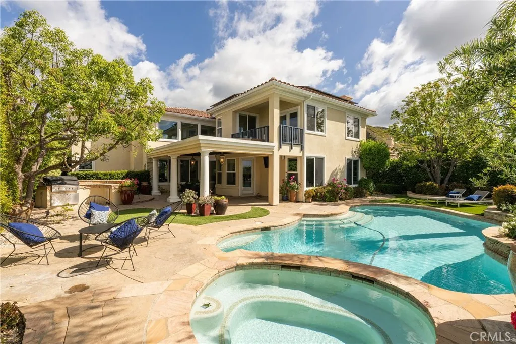 Welcome to this beautiful modern home in the heart of Porter Ranch located in the exclusive Renaissance community. The open floor plan seamlessly connects the kitchen, dining, and living areas. The designer kitchen features stainless steel appliances, built in refrigerator, custom oak shaker style cabinets, quartz countertops with enough barstool seating for 4. Adjacent to the dining room is a private room with wine fridge. Additional highlights include recessed lighting all throughout the home, paid off solar panels, security system and cameras, and 2nd-generation NEST thermostats. The massive primary suite offers a private balcony and an en-suite with beautifully laid tile, ample closet space, and a glass-enclosed shower. Each bedroom contains its own full sized bathroom. The backyard is built for gatherings with a pool, jacuzzi, BBQ pit, pergola covered patio for expansive seating, and nighttime views of the San Fernando Valley. Property is a short drive away from the The Vineyards at Porter Ranch, Porter Ranch Park and newly opened Jane and Bert Boeckmann Park. Priced to sell. Come see this home today!