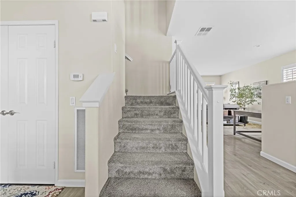 Located on a quiet cul-de-sac in the highly desirable Hasley Hills community, this beautifully maintained four bedroom, two and a half bath home offers a functional layout with the light, open feel buyers want. The living and dining areas flow naturally into the family room, creating an inviting space for everyday living and entertaining. The remodeled kitchen features white cabinetry, granite countertops, a full tile backsplash, stainless steel appliances, a center island, and pendant lighting that gives the space a clean, modern look. Wood-like floors extend throughout the first level, and a convenient powder room is located downstairs for guests. Upstairs, the primary suite offers great space with a walk-in closet and a private bath. All bedrooms are located on the second level, and the fourth bedroom, currently without a closet, works perfectly as an office, loft, playroom, or guest room. The home also includes newer carpet upstairs, plantation shutters, recessed lighting, and an indoor laundry room. The backyard feels private and peaceful with mature trees, lush landscaping, a covered patio, an above-ground spa, and your own avocado, fig, and black cherry trees. It is the perfect setting for relaxing or entertaining friends and family. With no Mello Roos, award-winning schools, and close proximity to shopping, restaurants, parks, and freeway access, this home delivers charm, comfort, and value in one of Castaic's most popular neighborhoods.