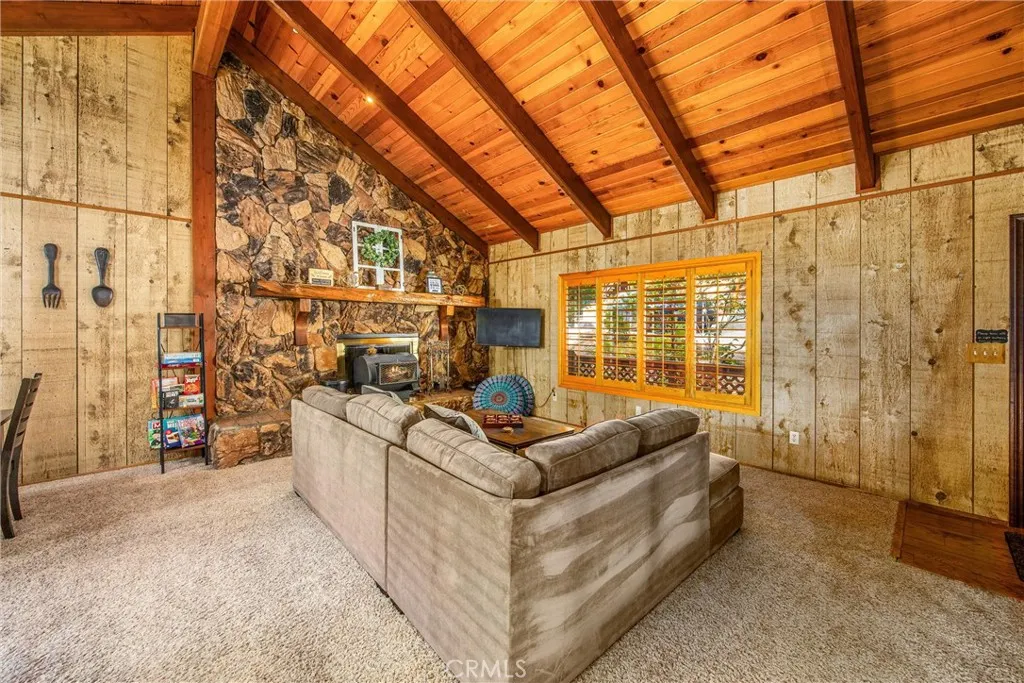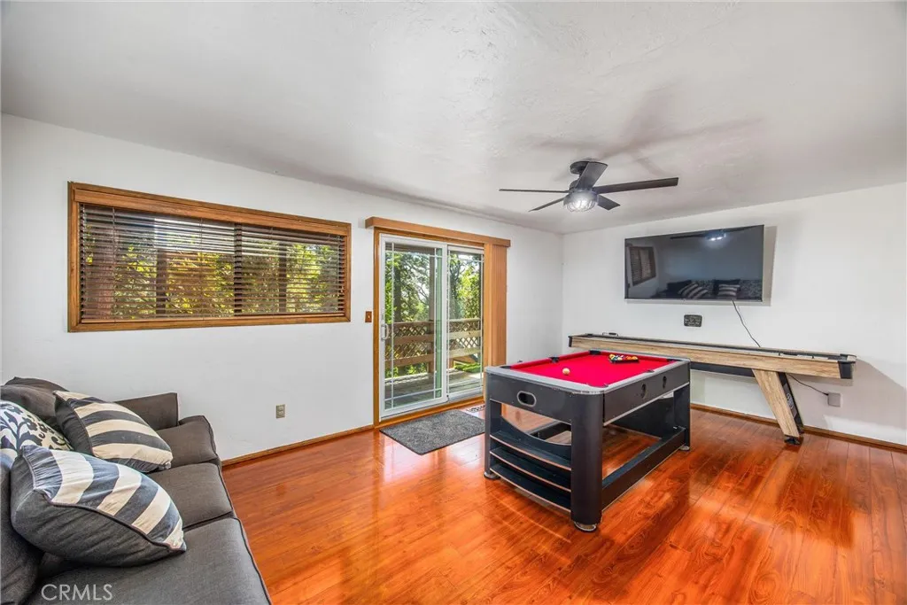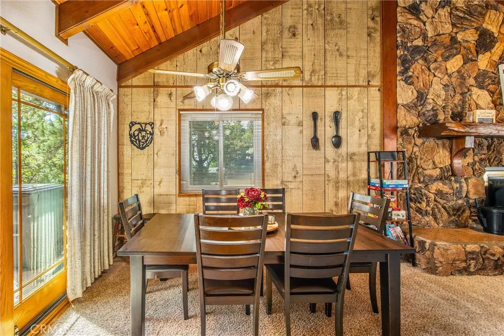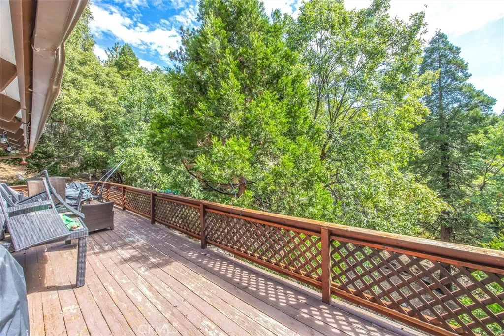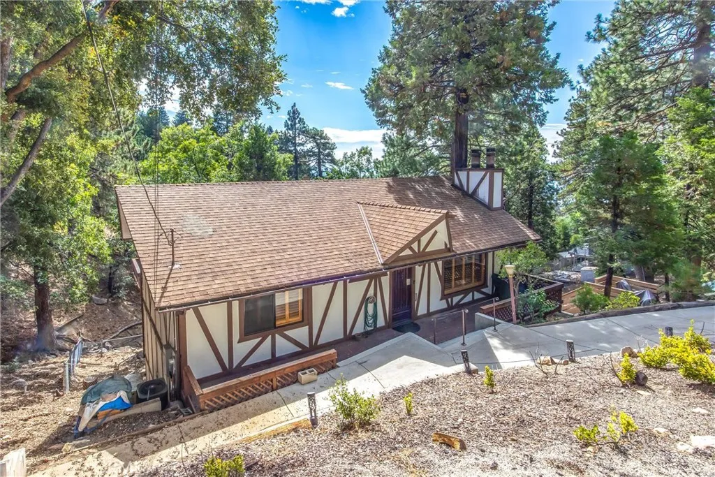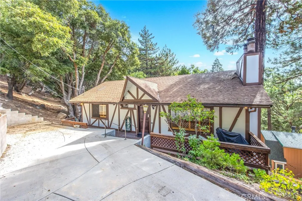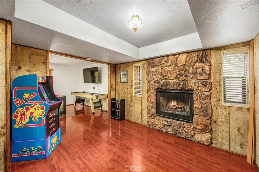 Welcome to this charming 4-bedroom, 3-bathroom mountain home tucked among the pines of Running Springs. The chalet-style exterior, front deck, and wide concrete driveway create inviting curb appeal while providing easy access and ample parking. Surrounded by mature trees and terraced hillside landscaping, the setting feels private and peaceful. With a brand new roof, house generator, and beautifully furnished interior, this home is truly move-in ready, so you can arrive and start enjoying mountain living right away. Inside, you will find vaulted wood-beamed ceilings, an open floor plan, and a warm stone fireplace, creating a welcoming, cozy atmosphere in the main living area. The spacious great room flows easily into the dining area and kitchen, making it ideal for family gatherings or entertaining guests. The kitchen feels warm and inviting with rich wood cabinetry, vaulted wood ceilings, and a long breakfast bar with seating that keeps everyone connected. Stainless steel appliances and generous counter space make meal prep simple, while the sliding glass door opens directly to the deck so you can enjoy outdoor dining and fresh mountain air. The lower level offers a fun and flexible space with two additional bedrooms, one of which is currently used as a game room. There is plenty of room for a sofa and game tables, complemented by wood-style floors, a ceiling fan, and a sliding glass door that opens to the trees outside. Just off this area is a cozy bar with seating, perfect for serving snacks and drinks. A second stone fireplace anchors the adjoining bonus room and creates a warm spot to gather for movie nights, arcade games, or relaxing after a day on the mountain. Whether you are looking for a full-time residence, a weekend getaway, or a furnished second home with investment potential, this Running Springs retreat offers comfort, character, and convenience in a peaceful forest setting.