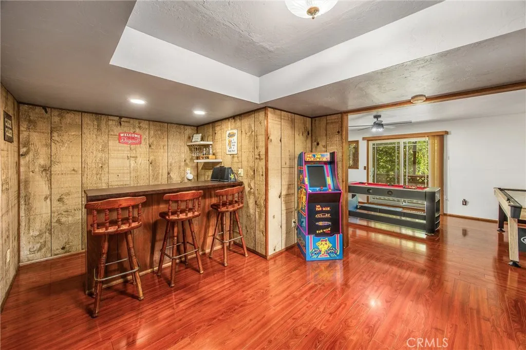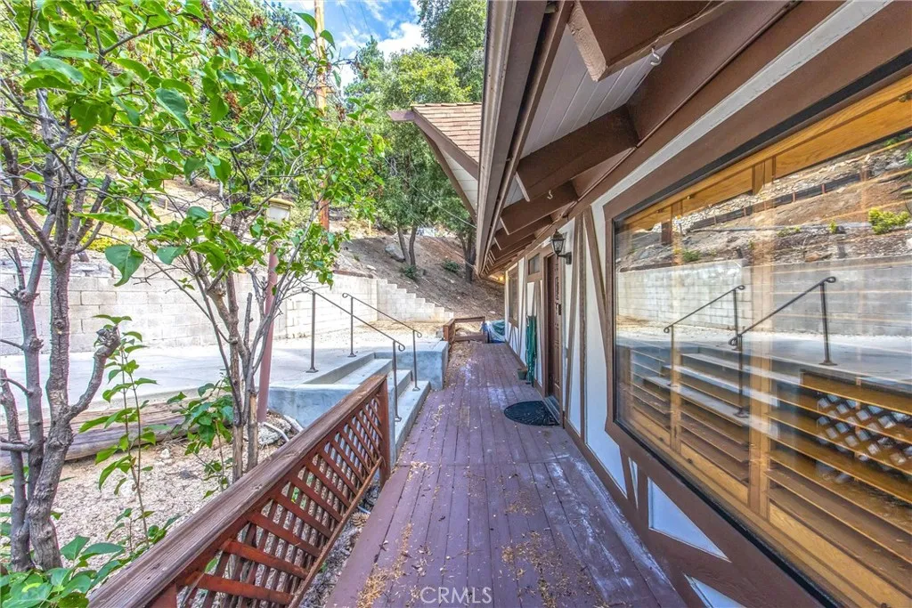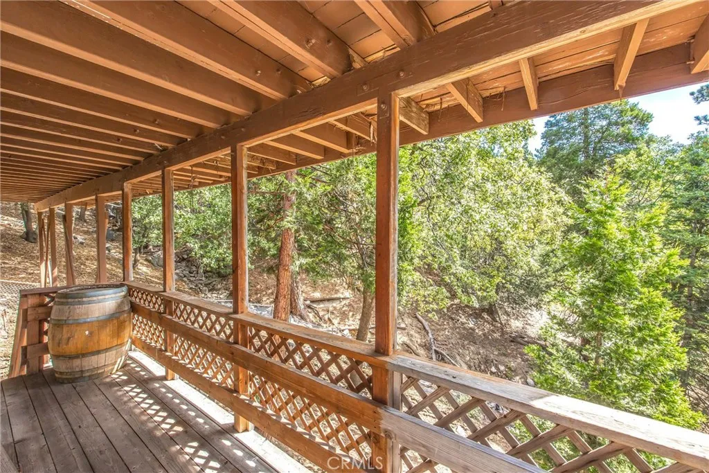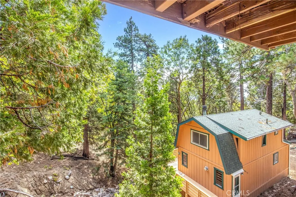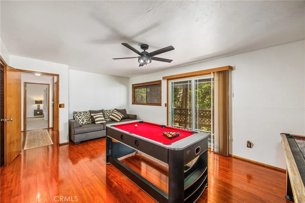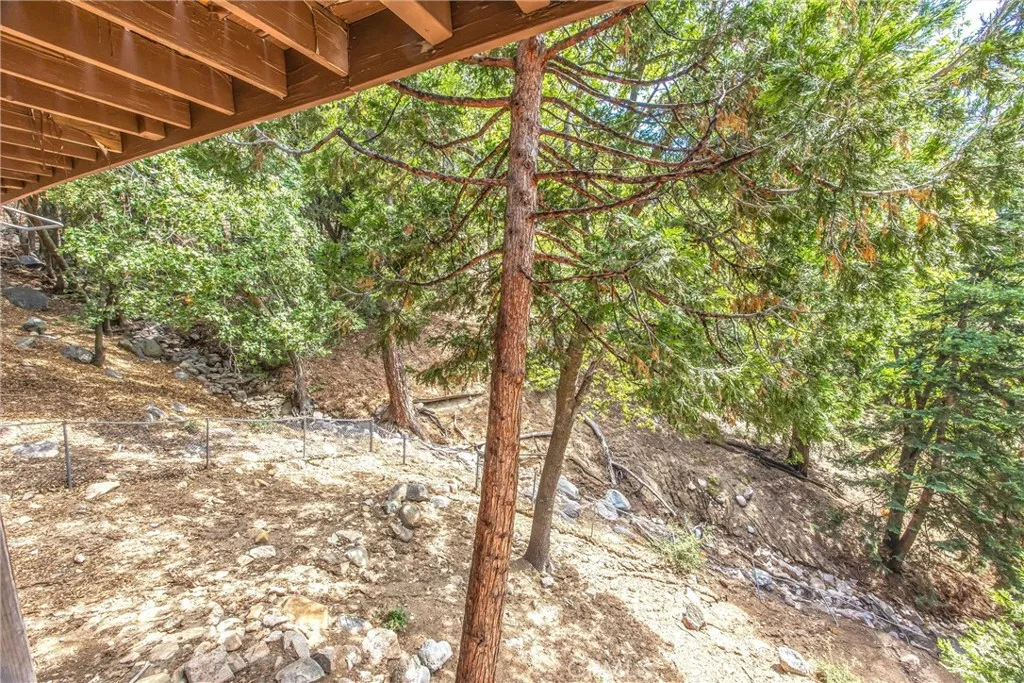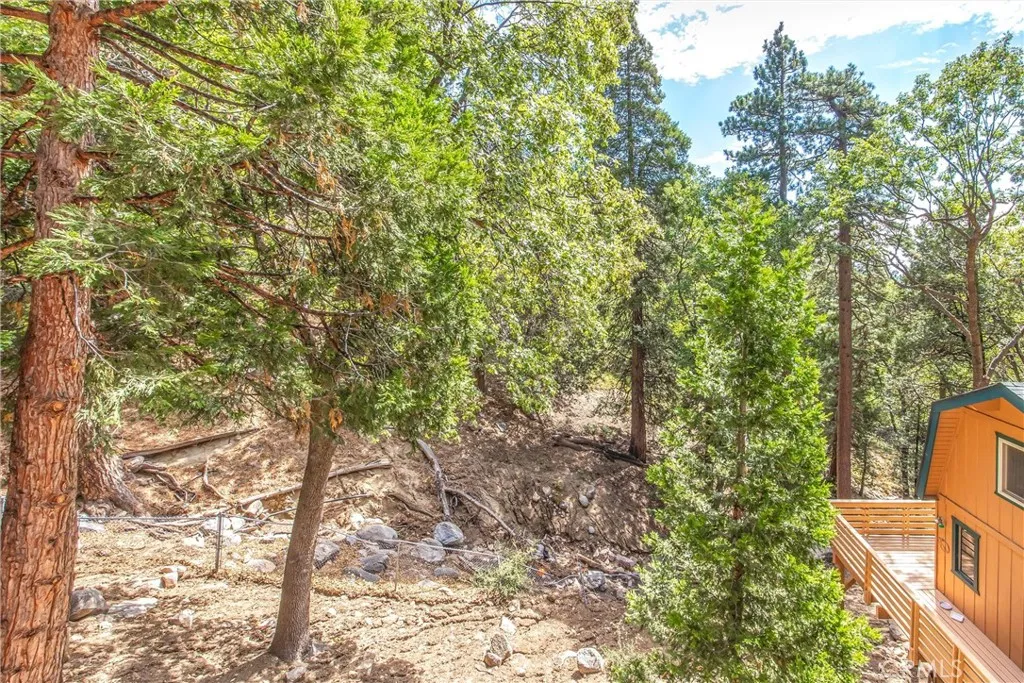 Welcome to this charming 4-bedroom, 3-bathroom mountain home tucked among the pines of Running Springs. The chalet-style exterior, front deck, and wide concrete driveway create inviting curb appeal while providing easy access and ample parking. Surrounded by mature trees and terraced hillside landscaping, the setting feels private and peaceful. With a brand new roof, house generator, and beautifully furnished interior, this home is truly move-in ready, so you can arrive and start enjoying mountain living right away. Inside, you will find vaulted wood-beamed ceilings, an open floor plan, and a warm stone fireplace, creating a welcoming, cozy atmosphere in the main living area. The spacious great room flows easily into the dining area and kitchen, making it ideal for family gatherings or entertaining guests. The kitchen feels warm and inviting with rich wood cabinetry, vaulted wood ceilings, and a long breakfast bar with seating that keeps everyone connected. Stainless steel appliances and generous counter space make meal prep simple, while the sliding glass door opens directly to the deck so you can enjoy outdoor dining and fresh mountain air. The lower level offers a fun and flexible space with two additional bedrooms, one of which is currently used as a game room. There is plenty of room for a sofa and game tables, complemented by wood-style floors, a ceiling fan, and a sliding glass door that opens to the trees outside. Just off this area is a cozy bar with seating, perfect for serving snacks and drinks. A second stone fireplace anchors the adjoining bonus room and creates a warm spot to gather for movie nights, arcade games, or relaxing after a day on the mountain. Whether you are looking for a full-time residence, a weekend getaway, or a furnished second home with investment potential, this Running Springs retreat offers comfort, character, and convenience in a peaceful forest setting.