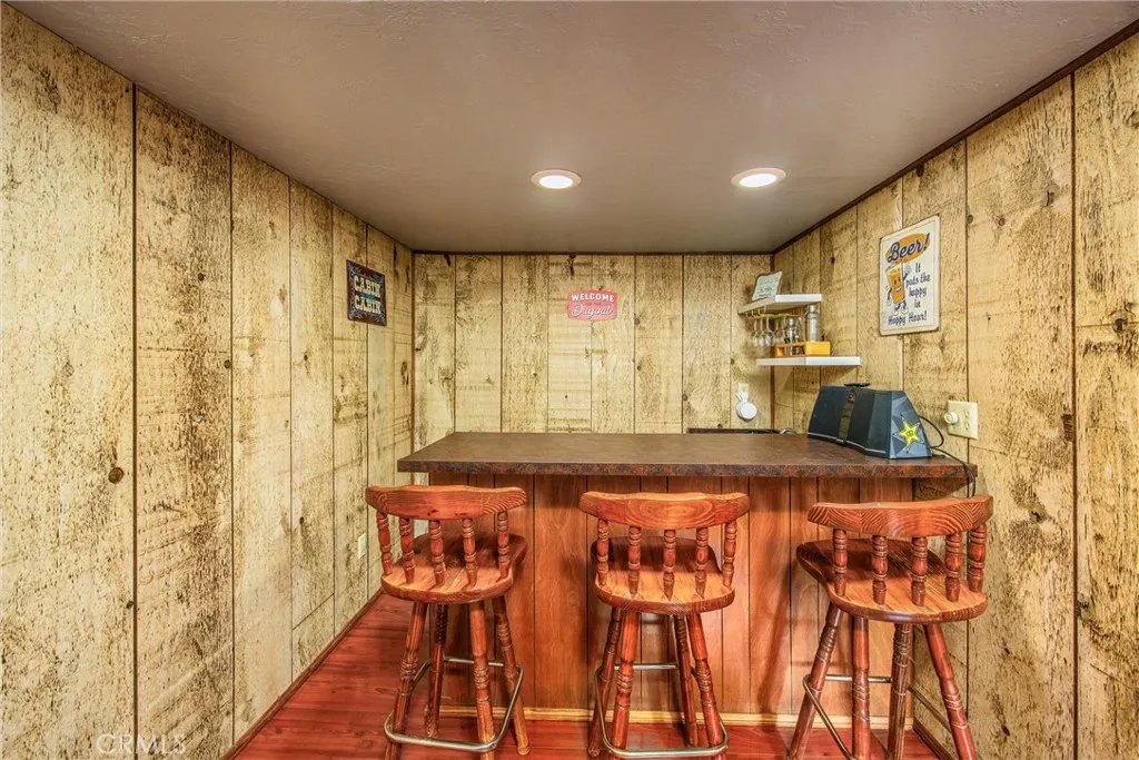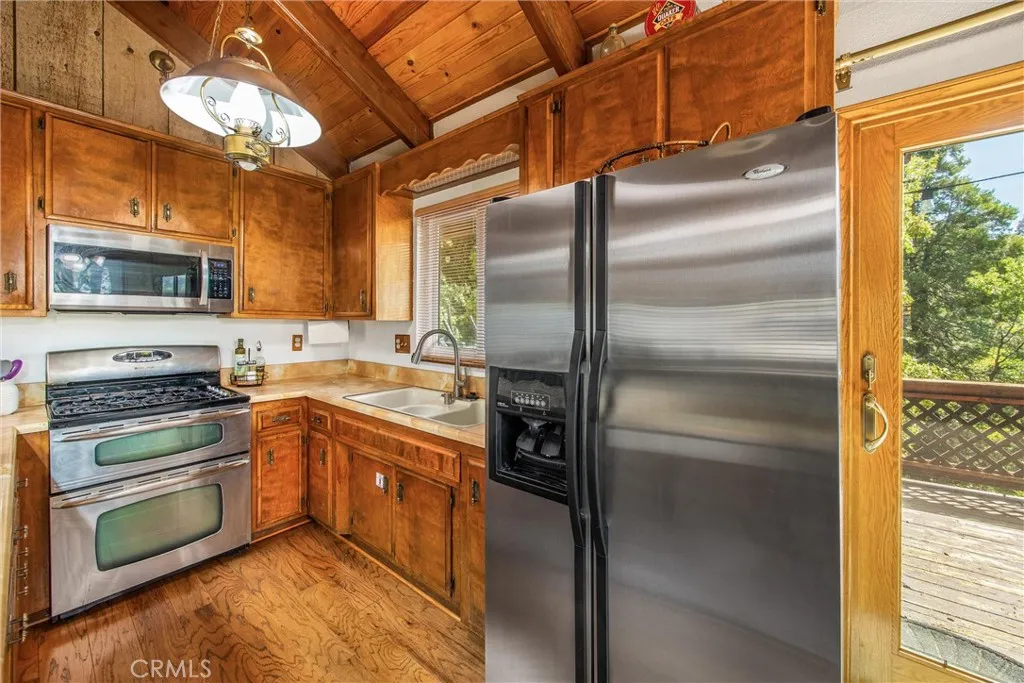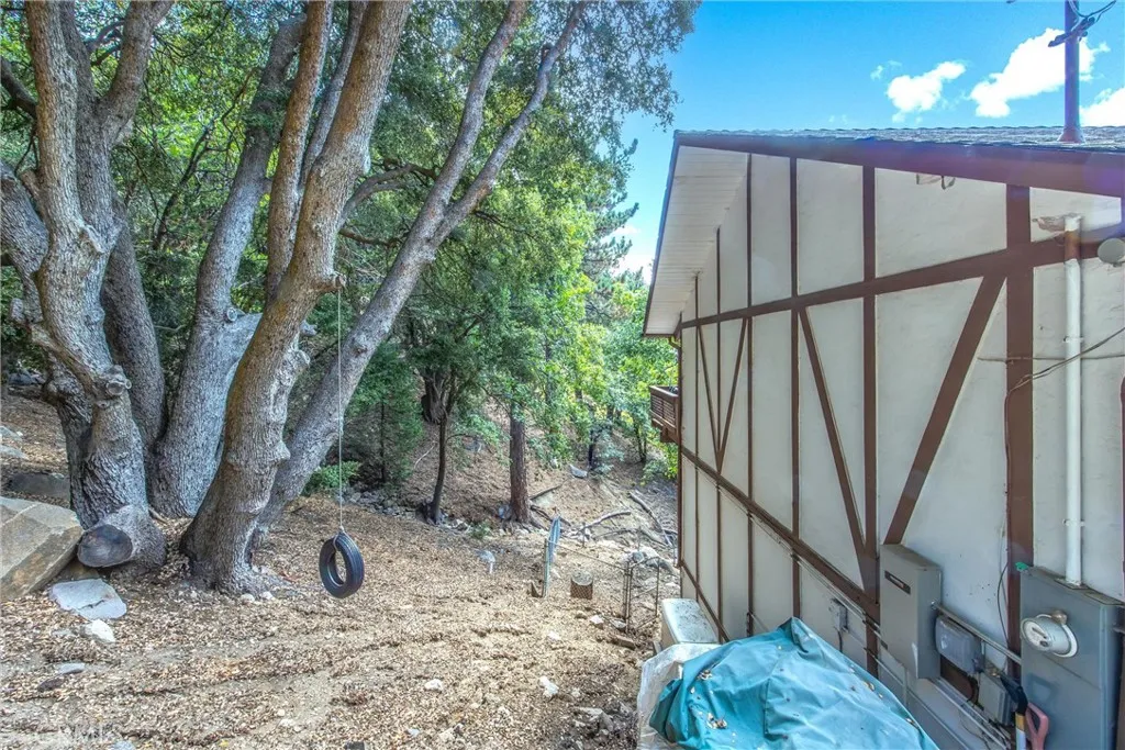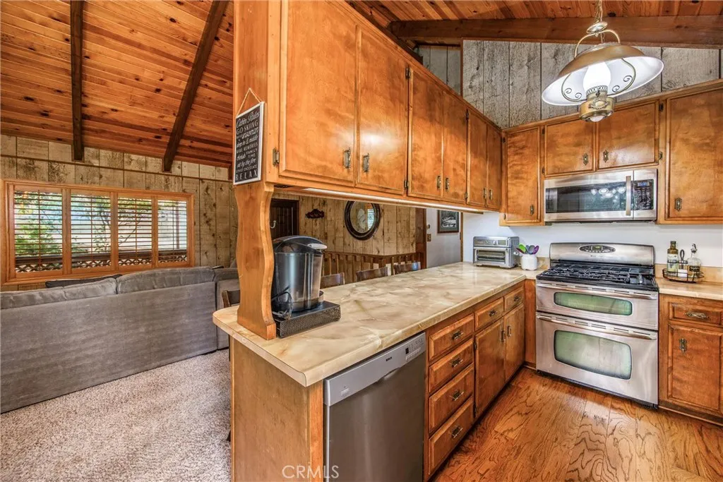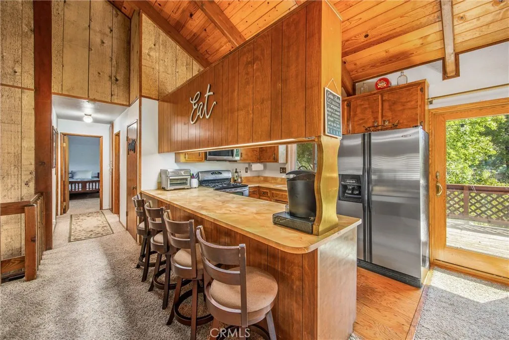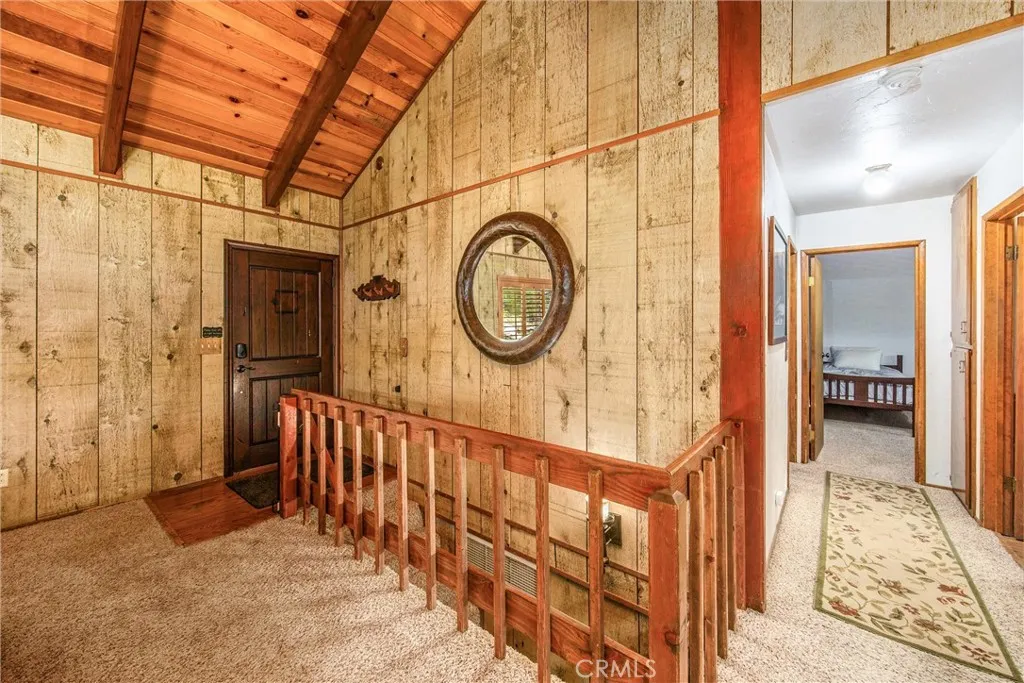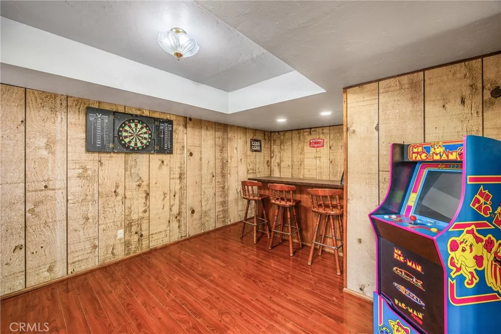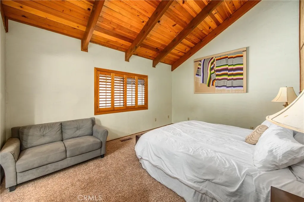 Welcome to this charming 4-bedroom, 3-bathroom mountain home tucked among the pines of Running Springs. The chalet-style exterior, front deck, and wide concrete driveway create inviting curb appeal while providing easy access and ample parking. Surrounded by mature trees and terraced hillside landscaping, the setting feels private and peaceful. With a brand new roof, house generator, and beautifully furnished interior, this home is truly move-in ready, so you can arrive and start enjoying mountain living right away. Inside, you will find vaulted wood-beamed ceilings, an open floor plan, and a warm stone fireplace, creating a welcoming, cozy atmosphere in the main living area. The spacious great room flows easily into the dining area and kitchen, making it ideal for family gatherings or entertaining guests. The kitchen feels warm and inviting with rich wood cabinetry, vaulted wood ceilings, and a long breakfast bar with seating that keeps everyone connected. Stainless steel appliances and generous counter space make meal prep simple, while the sliding glass door opens directly to the deck so you can enjoy outdoor dining and fresh mountain air. The lower level offers a fun and flexible space with two additional bedrooms, one of which is currently used as a game room. There is plenty of room for a sofa and game tables, complemented by wood-style floors, a ceiling fan, and a sliding glass door that opens to the trees outside. Just off this area is a cozy bar with seating, perfect for serving snacks and drinks. A second stone fireplace anchors the adjoining bonus room and creates a warm spot to gather for movie nights, arcade games, or relaxing after a day on the mountain. Whether you are looking for a full-time residence, a weekend getaway, or a furnished second home with investment potential, this Running Springs retreat offers comfort, character, and convenience in a peaceful forest setting.