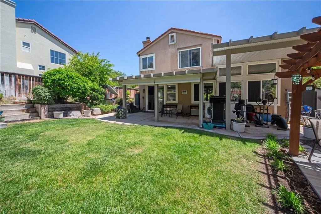 A hidden gem nestled on a cul-de sac with the most amazing backyard sporting lush plantings, tinkling water and a pergola overlooking a park so no neighbors behind you. Perfect for outdoor entertaining with an alumawood patio along the full length of the house with beautifully cultivated flower beds brimming with thriving plants and trees, including several fruit bearing trees. The kitchen with a breakfast bar and plenty of counter space, abuts the family room featuring a cozy fireplace and opens to the outdoor entertainment area. There is also a living room /dining room combo with vaulted ceilings and plenty of windows which bring the outdoors inside. There is a half bathroom and laundry room downstairs. The house has four bedrooms and two and a half bathrooms including a spacious master with dual sinks and a walk in shower and closet. In addition to low taxes, the HOA provides tons of amenities including several pools, tennis courts, club house, parks and lots of shaded walking trails. The convenient location is close to multiple award winning schools as well as shops and restaurants.