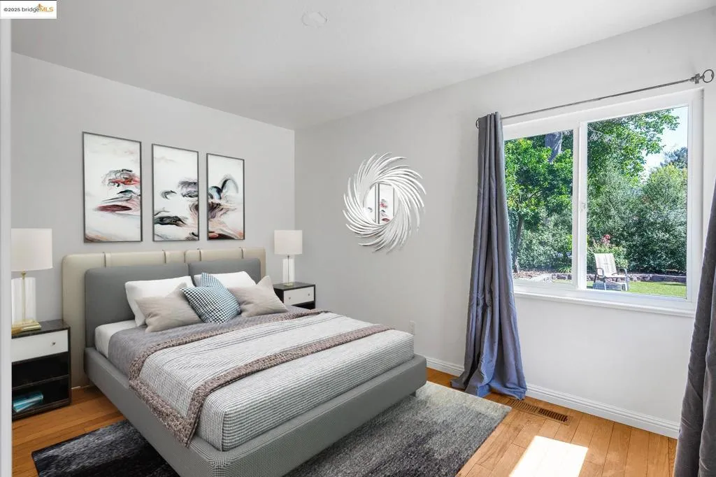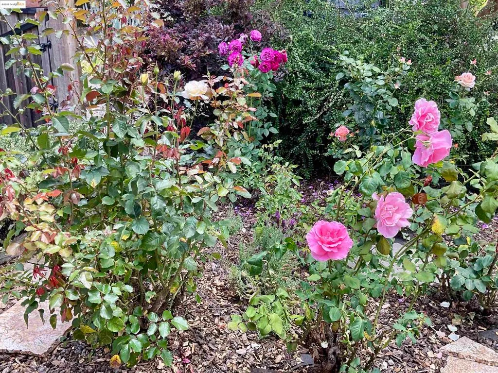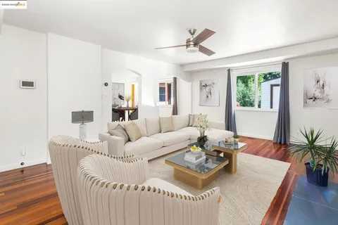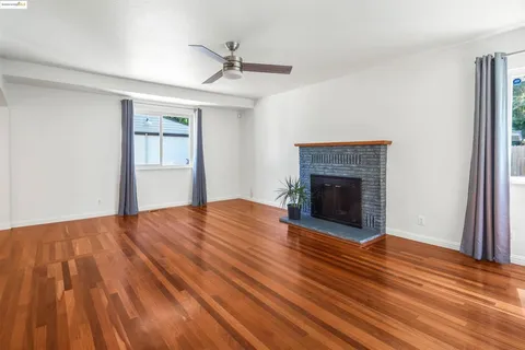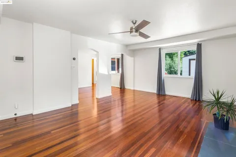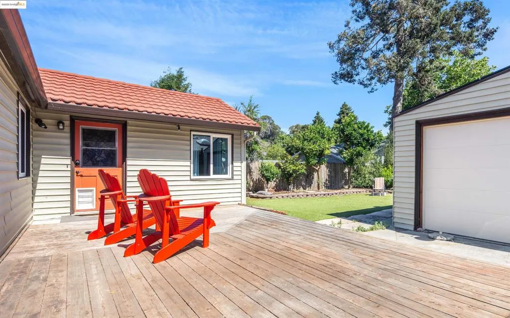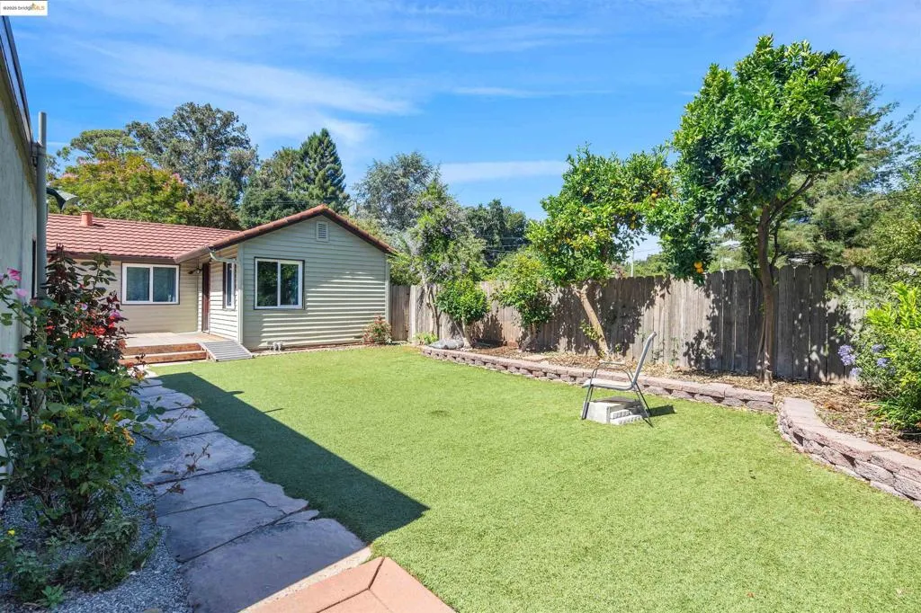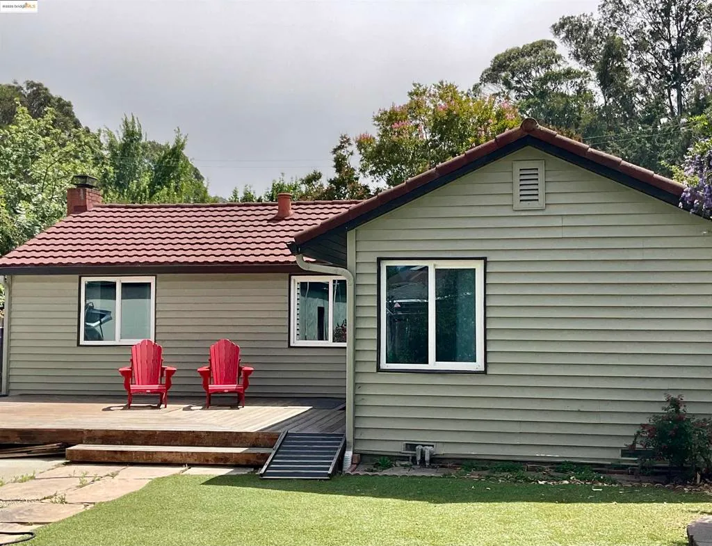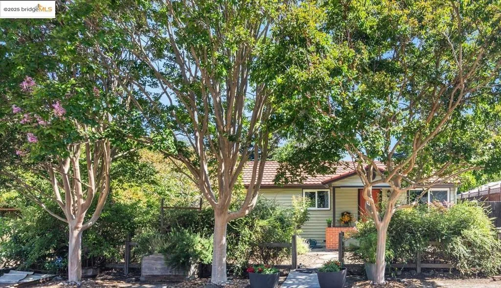 Nestled on a charming tree-lined street and minutes to open space, sits this darling 2-bedroom, 1-bath home with vinyl siding, dual pane windows, and a Lifetime standing seam steel roof. Home features include an 18-panel owned solar, green views from most windows, and Brazilian Walnut flooring throughout the main living area and hallway. Bedrooms feature oak hardwood floors; the primary bedroom has calming green views, built-in rolling drawers, and a large closet. The sunny kitchen features white cabinets equipped with swivel racks, roll-out shelving, under-cabinet lighting, tile counters, a gas range, and beautiful views out to the English-style rose garden. The comfortable living room features a fireplace with a Heatilator insert, perfect for those chilly nights. The yard features a relaxing deck, mature fruit trees, and a turf area surrounded by privacy plantings. A rose garden adorns the side of the 550 sq ft garage, which features 220v, washer/dryer hook-ups, an equipment cage, a new garage door, space for two cars, storage, and a workshop. Beyond the garage is an artist studio or home office equipped with power and internet. Just minutes to Orinda shopping, East Bay Regional Parks, many commute options, and a short drive to San Francisco for world-class dining and museums.