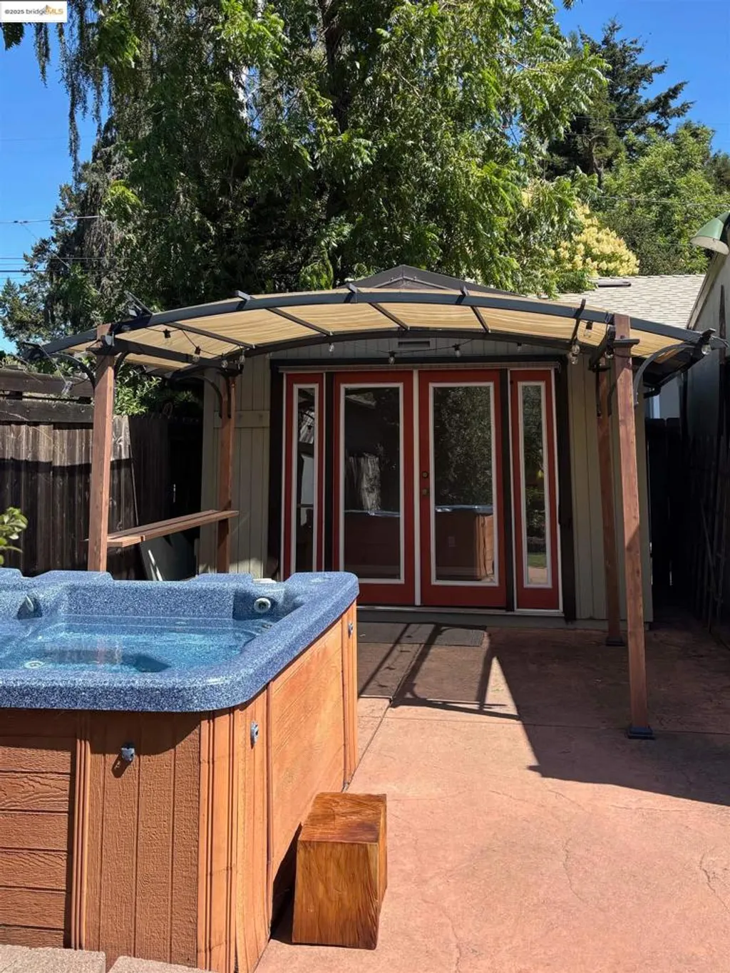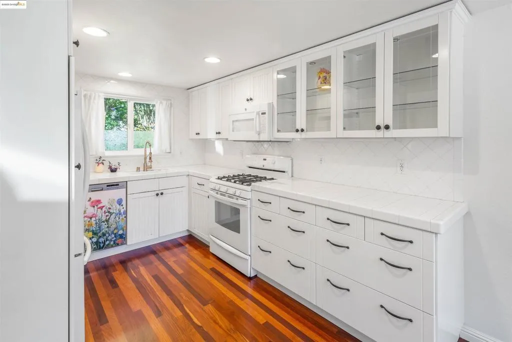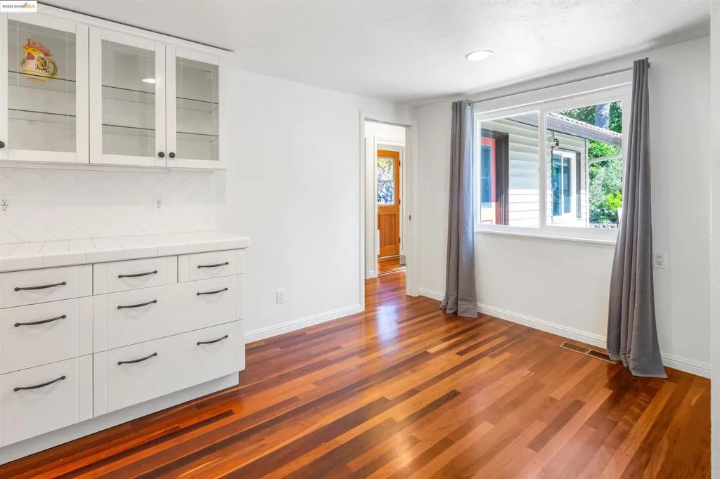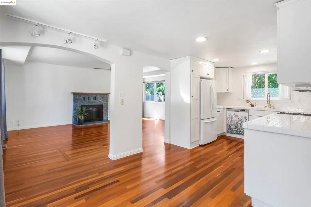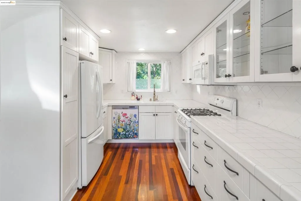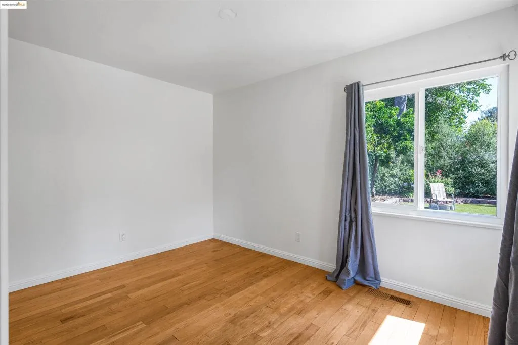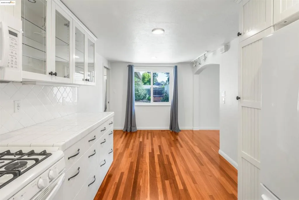 Nestled on a charming tree-lined street and minutes to open space, sits this darling 2-bedroom, 1-bath home with vinyl siding, dual pane windows, and a Lifetime standing seam steel roof. Home features include an 18-panel owned solar, green views from most windows, and Brazilian Walnut flooring throughout the main living area and hallway. Bedrooms feature oak hardwood floors; the primary bedroom has calming green views, built-in rolling drawers, and a large closet. The sunny kitchen features white cabinets equipped with swivel racks, roll-out shelving, under-cabinet lighting, tile counters, a gas range, and beautiful views out to the English-style rose garden. The comfortable living room features a fireplace with a Heatilator insert, perfect for those chilly nights. The yard features a relaxing deck, mature fruit trees, and a turf area surrounded by privacy plantings. A rose garden adorns the side of the 550 sq ft garage, which features 220v, washer/dryer hook-ups, an equipment cage, a new garage door, space for two cars, storage, and a workshop. Beyond the garage is an artist studio or home office equipped with power and internet. Just minutes to Orinda shopping, East Bay Regional Parks, many commute options, and a short drive to San Francisco for world-class dining and museums.