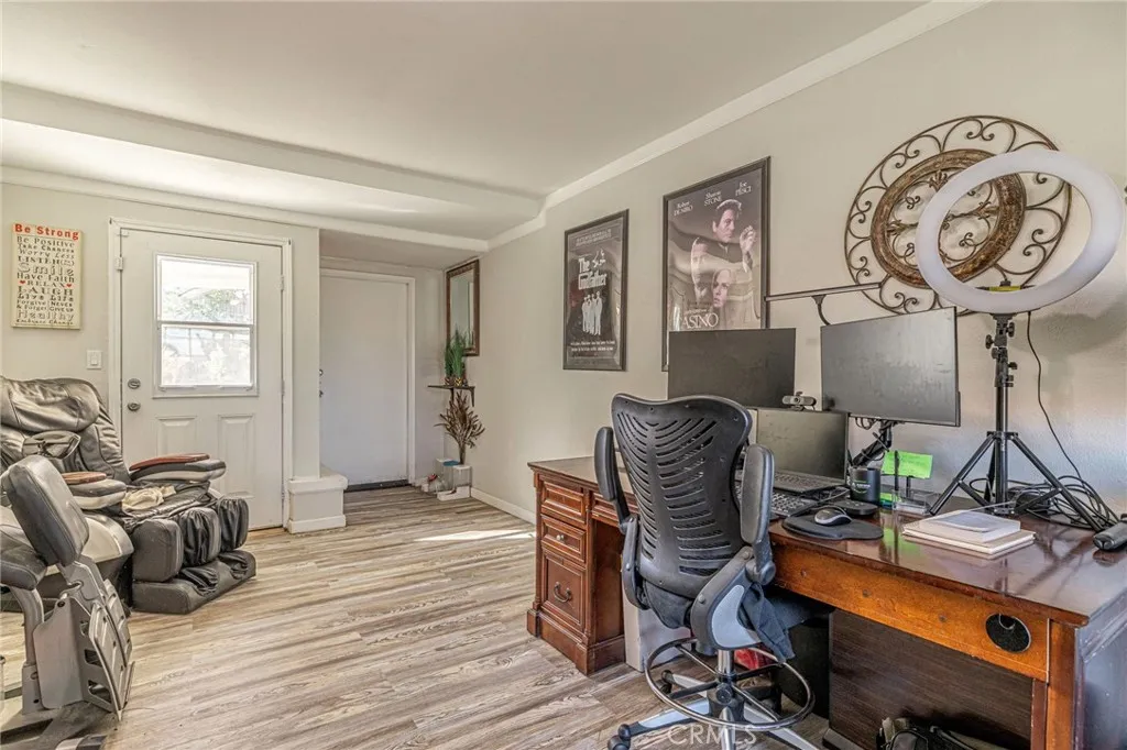 Welcome to a residence where elegance, efficiency, and entertainment unite in one stunning property. Nestled in the prestigious West Palmdale/Quartz Hill area, this luxury estate offers 4 bedrooms, 3 full baths, and 3,218 sq. ft. of refined living space, plus an additional 200 sq. ft. office/flex room not included in the total. Office upstairs can double as 5th bedroom(by adding a closet), provides versatile options for work or leisure. Set on a beautifully landscaped 21,212 sq. ft. lot, this home is designed for resort-style living. Enjoy a Pebble Tec pool and spa, 8-person sauna, covered patio, and multiple outdoor spaces for dining, games, and relaxation under breathtaking sunsets. 46 owned solar panels with two backup batteries, Tesla app integration, and a smart thermostat system for HVAC and irrigation ensure modern energy efficiency and comfort. Through elegant double doors, you're greeted by a grand staircase, chandelier, and bright open floor plan. The formal living (with sliding doors to the backyard) and dining rooms, feature engineered plank flooring, and exquisite architectural details throughout. A downstairs guest suite with nearby full bath offers privacy and flexibility. The primary retreat features a cozy fireplace in the blt-in cabinet (which stays), spa-inspired bath with soaking tub, separate shower, and dual sinks. Upstairs includes additional bedrooms plus a flex space perfect for an office or studio. The gourmet kitchen includes newer stainless appliances (refrigerator incl.), and the laundry room has a built-in desk. A two-car garage provides ample storage and access to the bonus office/fitness room. Surrounded by roses, palm, pomegranate, fig, and apple trees, custom lighting, and multiple entertaining zones, this estate offers a rare blend of luxury, sustainability, and sophistication - a true sanctuary close to top-rated schools, parks, and shopping.
