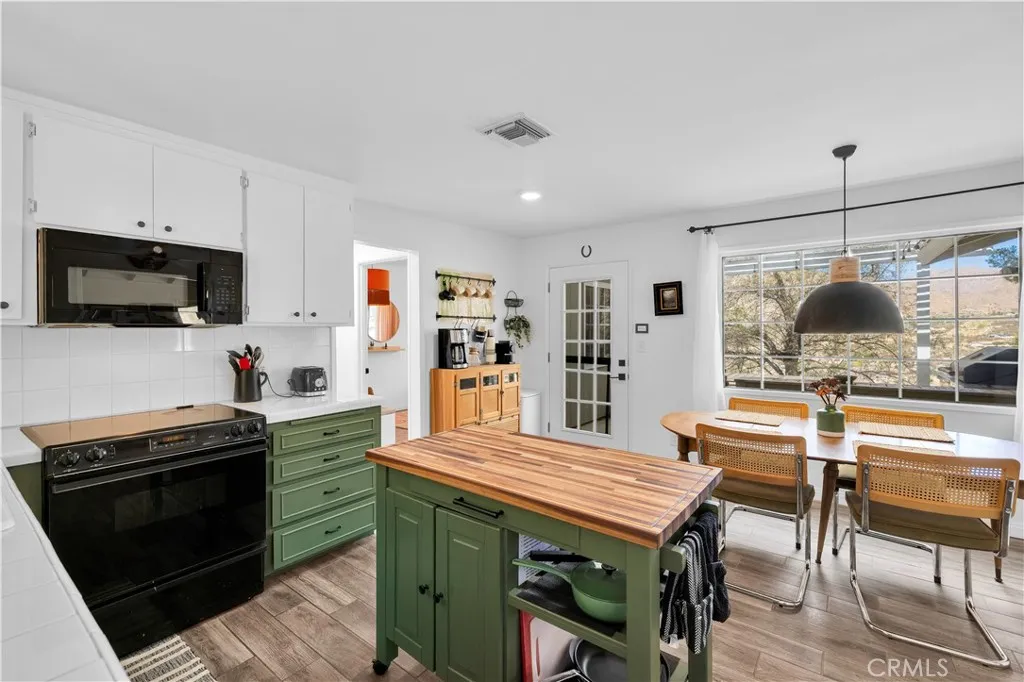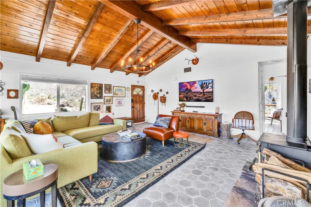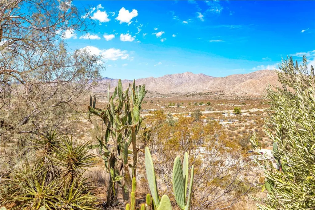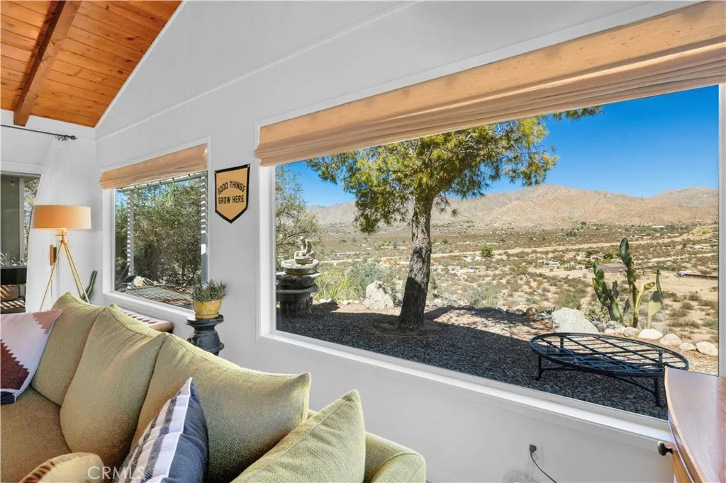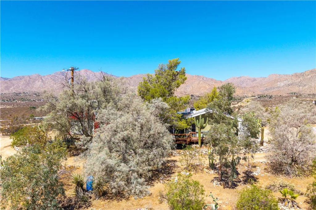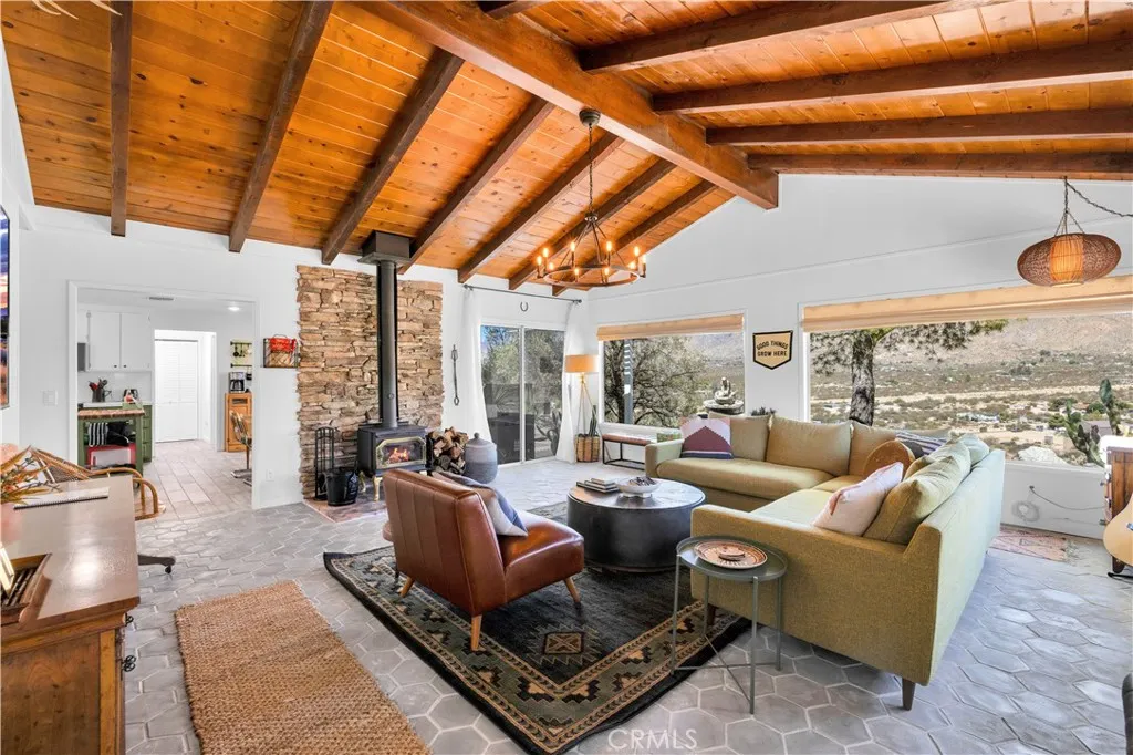 Gorgeous two-bedroom, one-bath home perched on a hilltop with 360 panoramic views! As you pull up to the property, you'll immediately notice the incredible vistas that surround the home - rolling desert hills, open skies, and unmatched privacy. Step inside and prepare to be wowed by the vaulted tongue-and-groove ceilings and the stunning bank of windows that perfectly frame those breathtaking views. A cozy wood-burning stove sits in the living room, perfect for chilly winter evenings, while stylish hexagon tile flooring flows throughout the space and into the primary bedroom. The primary bedroom continues the theme of high ceilings and expansive windows, making the most of the natural light and open feel. The centrally located kitchen offers plenty of cabinet space, great storage, and a designated dining area. What makes this room truly special is its access to two separate patios, one north-facing and one south-facing, so you can enjoy sun or shade any time of day. The second bedroom is nicely sized and, like the rest of the home, offers that same incredible view. The bathroom has been tastefully remodeled with a beautiful tile walk-in shower, giving it a modern yet timeless feel. Step out onto the southern-facing patio and you'll find a large wooden deck shaded by mature trees, creating a private and serene outdoor oasis. It's a magical spot to relax, entertain, or simply soak in the scenery. To top it off, there's a large detached barn for additional storage or potential creative use. All of this sits on a full five acres with its own well - plenty of space, privacy, and potential in a one-of-a-kind setting.