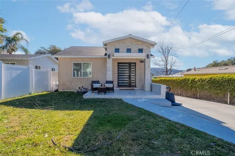 Discover this unique property offering two homes on a spacious lot of nearly 7700 square feet in the heart of Tujunga. With a front house and a newly constructed 3 bedroom ADU built in 2022, this property provides an excellent opportunity for multi generational living, rental income, or extended family accommodations. The front house features 2 bedrooms, 1.5 bathrooms, and 1028 square feet of living space and is rented at 3250 dollars per month. Live in the back ADU and enjoy the rental income from the front house. Interior highlights include a spacious recreation room, a modern kitchen with a quartz stone island, abundant cabinetry, and stainless steel appliances including a range stove and dishwasher. The living room features a fireplace, custom decorative moldings, and recessed LED lighting. Bathrooms are updated with modern fixtures, a glass shower enclosure, and a sleek wall mounted vanity. The ADU is a 3 bedroom 2 bathroom home with a primary suite that includes a full bath and decorative tile finishes. This new construction offers double pane windows, central air and gas heating, and laminate wood flooring. The outdoor space is fully landscaped with a new sprinkler system and provides ample room for relaxation, entertaining, or future projects. This property combines comfort, modern design, and versatility on a rare large lot in Tujunga.